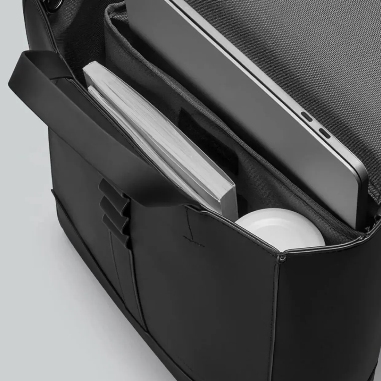 Material: 100 % återvunnen polyester med polyuretanbeläggning. Metallbeslag: 100 % järn (Fe). Band: 100 % återvunnen nylon. Foder: 100 % polyester. Spännmaterial för remmar: Polyvinylklorid / Järn (Fe).