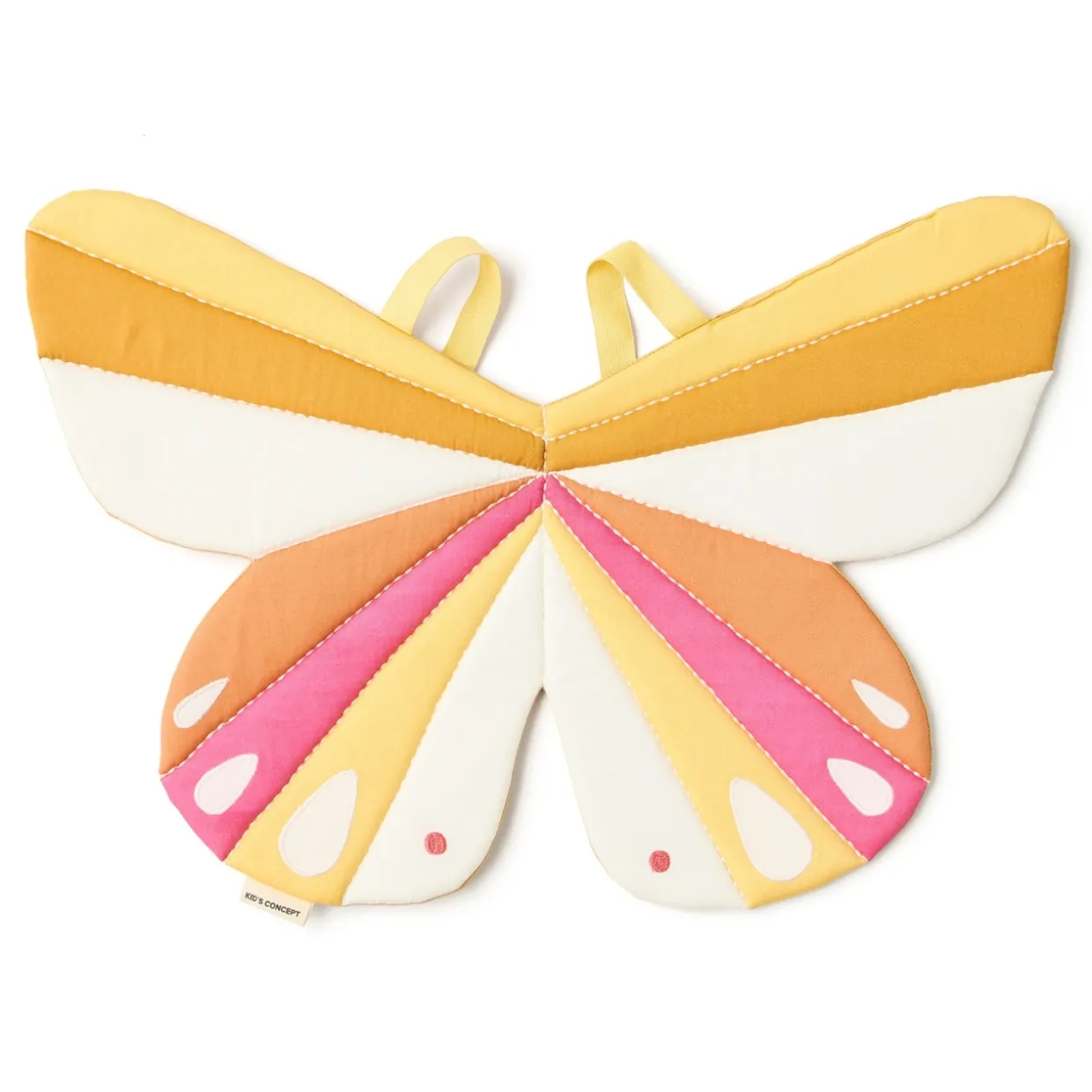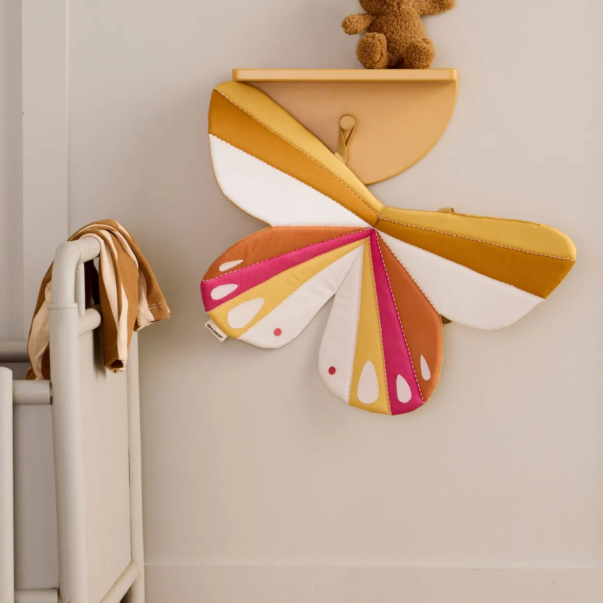 ”Fjärlien svävar på mjuka vindar, dess ömtåliga vingar målar luften med en lätt rörelse.” De här vingarna är designade för att bäras på ryggen med elastiska axelband, vilket gör dem både enkla och bekväma att ta på. Vingarna är vadderade för att behålla sin form under leken, och de broderade detaljerna ger både stadga och textur. Utklädningslek hjälper barn att utforska sin kreativitet och utveckla sina berättarförmågor, och vingar som dessa uppmuntrar till aktiv rörelse när de låtsas ”flyga”. Den enkla designen gör det lätt för barnen att ta på sig själva, vilket stödjer självständig lek.