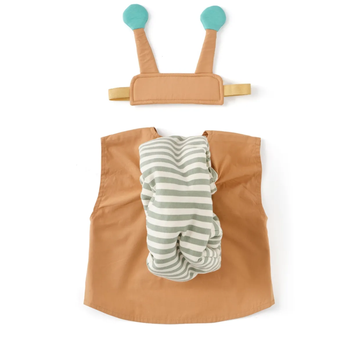 Visste du att sniglar bär sina hem på ryggen och kan dra sig in i sitt skal när de behöver vila eller hålla sig säkra? Smidigt, eller hur? Den här snigelkostymen fångar charmen hos dessa fascinerande djur. Västen har en rundad framkant och en lätt vadderad design på baksidan som efterliknar ett snigelskal, med enkla kardborreknäppningar på framsidan av västen. Kostymen inkluderar också ett vadderat pannband med mjuka antenner. Tyget är tillverkat i certifierad bomull.