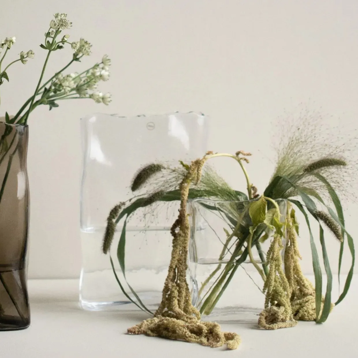 Meadow vas H18 cm från DBKD är tillverkad i glas med en oregelbunden, avlång form och en något ojämn överkant, vilket ger den en oregelbunden känsla. Perfekt som vas eller kruka för mindre fönsterbrädor.