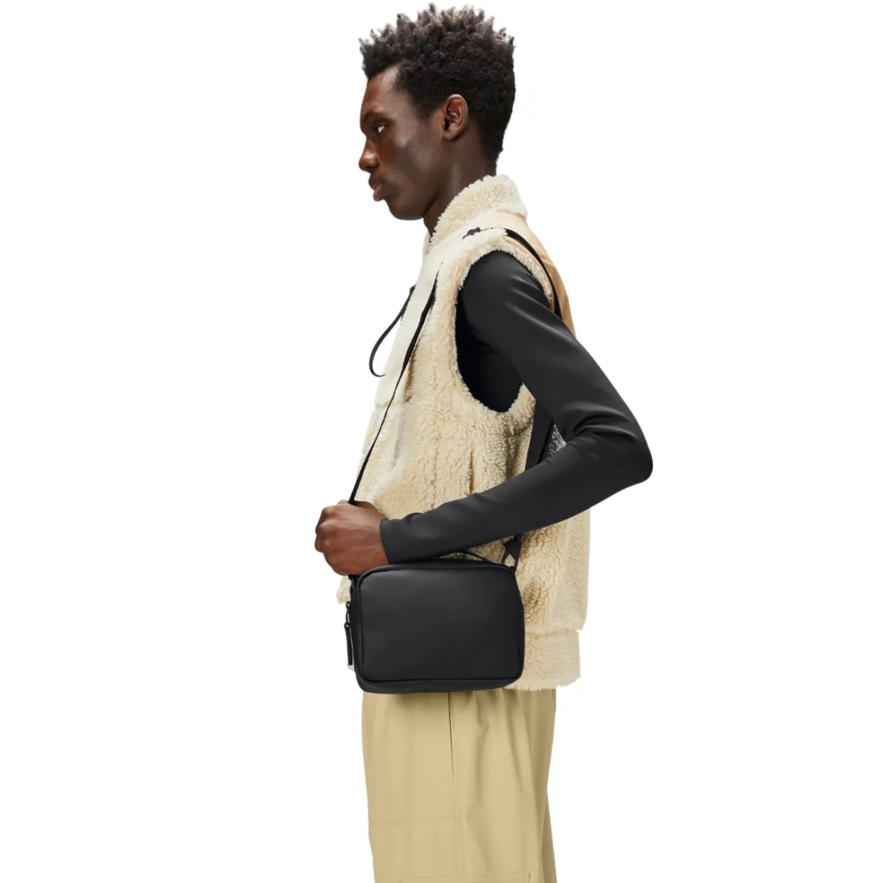 Box Bag är en ren men ändå funktionell vattentät väska, designad för att bäras över axeln, över kroppen eller som en handväska. Dess minimala boxiga siluett kan enkelt stylas och är en idealisk storlek för att bära ett extra lager och dagliga nödvändigheter. Designen är avslutad med en justerbar bandrem, fäst med karbinhakar. Box Bag är skuren i Rains signatur vattentäta PU-tyg, konstruerad för att bära styrka, hållbarhet och en smidig känsla.