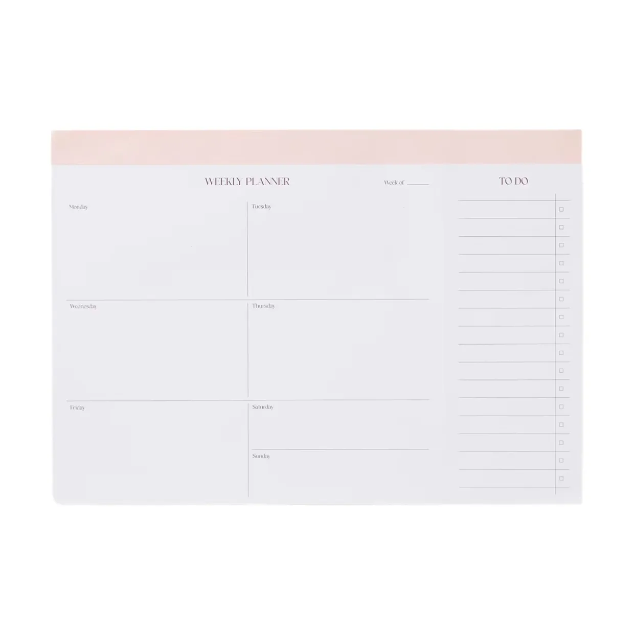 Praktisk veckoplanerare i A4-format med rutor för varje dag och en separat att göra-lista.